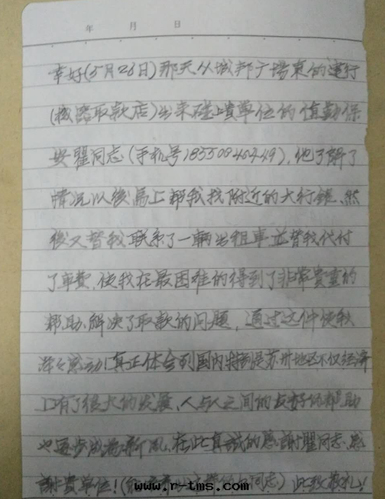 5月(yuè)下(xià)旬,队员翟紅(hóng)衛在上(shàng)班(bān)執勤期(qī)間(jiān)遇到(dào)一(yī)位老(lǎo)人(rén)求助,老(lǎo)人(rén)是(shì)位多(duō)年的(de)旅日(rì)華僑,初到(dào)苏州人(rén)生(shēng)地(dì)不(bù)熟,急需去(qù)银(yín)行取(qǔ)款但又不(bù)知道詳细(xì)位置且(qiě)沒(méi)有(yǒu)攜带(dài)现金。在了(le)解(jiě)了(le)基本(běn)情(qíng)況之後(hòu),队员翟紅(hóng)衛當即为(wèi)老(lǎo)人(rén)查找(zhǎo)了(le)附近(jìn)的(de)银(yín)行地(dì)址並(bìng)代(dài)付了(le)車費。